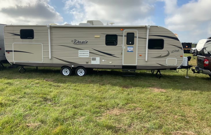 We hope that your family enjoys our home away from home. Our Travel trailer has a split floor plan. master bedroom located in the front of the unit and the twin size bunk bed with a full size bed in the back of the camper in the middle it has the common area which has a slider to give you More room to move around.