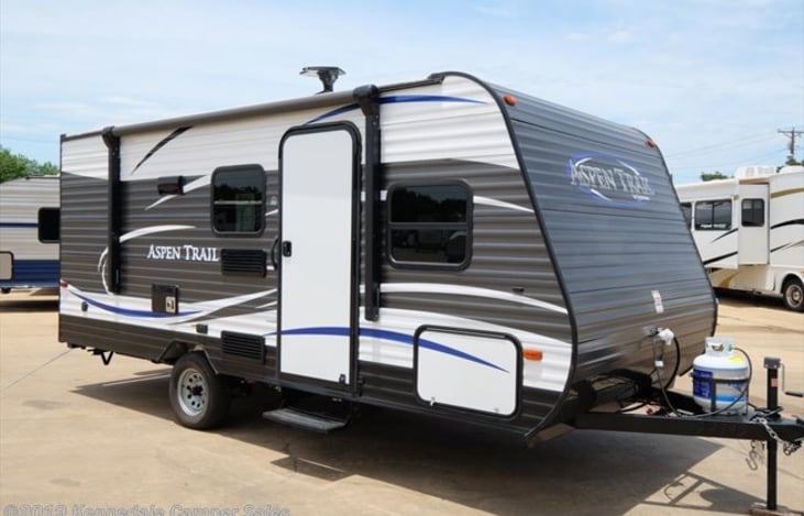 Just imagine taking your whole family to an away game, your farm, and a state park in this Aspen Trail travel trailer. This model 1700BH provides plenty of sleeping space for five from the bunk beds, queen bed, and folded down dinette.