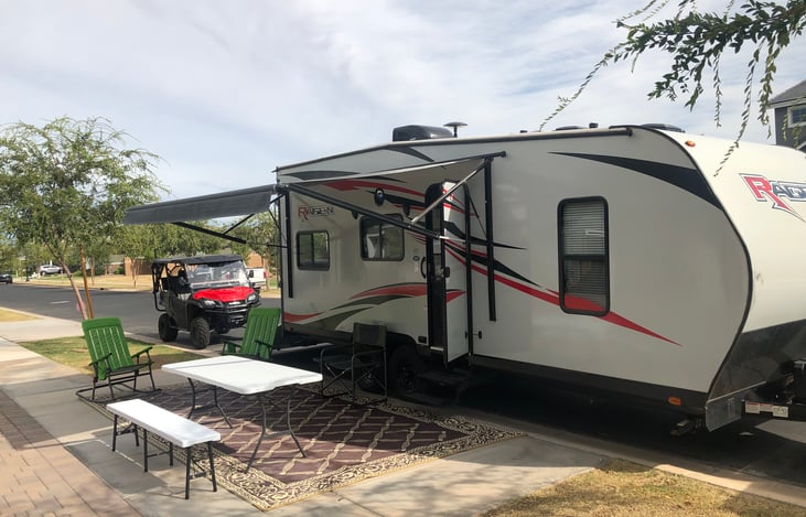 Bob's Camper- 2019 Pacific Coachworks Rage'n Toy Hauler, perfect for family outings, escapes and your "TOY" SXS, quads or motorcycles with 20 gallon fueling station. It sleeps 6 very comfortably, upgraded "COOL GEL" memory foam mattresses. Light weight so you can pull with any full size truck to a great destination to make lasting memories!