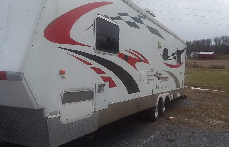 This unit boasts a massive storage area. Can easily haul 2 full dressers (Bikes) in the storage area. Sleeps 7-8 and includes a weight distribution hitch. 6500 lbs empty weight. Must have a brake controller. All tanks must be emptied or a $75 dump fee will be applied. Winter use will have a winterize fee of $75. All bedding and amenities must be provided by renter. Hookups included.