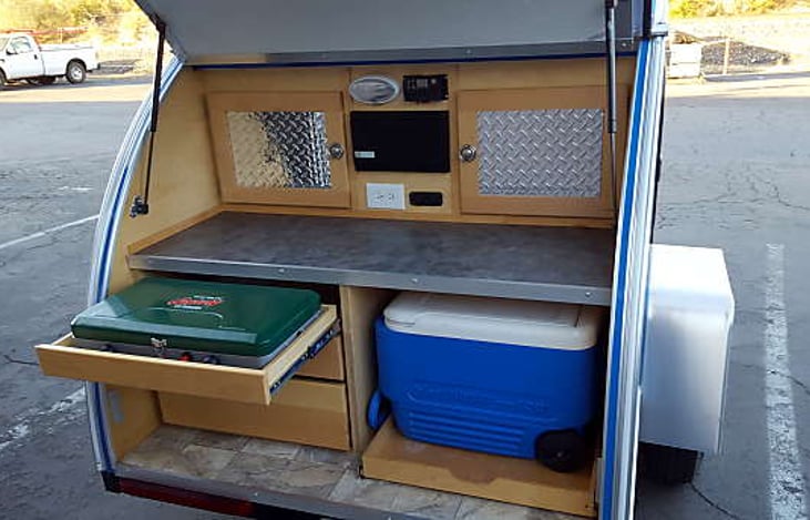 American Teardrop trailers are lightweight camping trailers that can be towed by any vehicle. Camping is now made easy with a dry comfortable place to sleep and a cooking area ready to go. This unit has a queen bed.