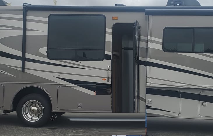 Enjoy the comfort of a home away from home. Full kitchen with peninsula overlooking an oversize window, stove, combo microwave, gas hoven, residential refrigerator. 3 slide out. Separate bedroom with tons of closets. Washer and Dryer. tons of storage. Fully contain with large water tanks and generator you can stay off the grid for up to a week 2 people or 4 days 4 people. Get additional extras lik...
