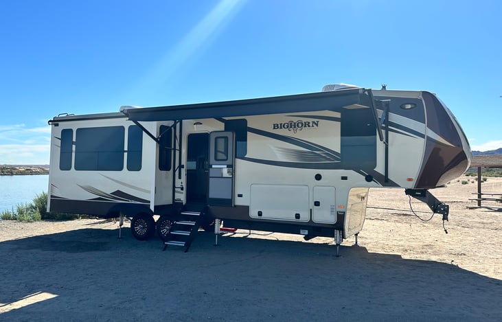 Clean and comfortable! Sleeps 4. Large living room with hide-a-bed, electric fireplace, ceiling fan, reclining loveseat, 3 slides, lots of storage, outside shower, full size residential refrigerator, cookware, utensils, coffee maker, king bed, sofa bed. Large tinted windows for great views.