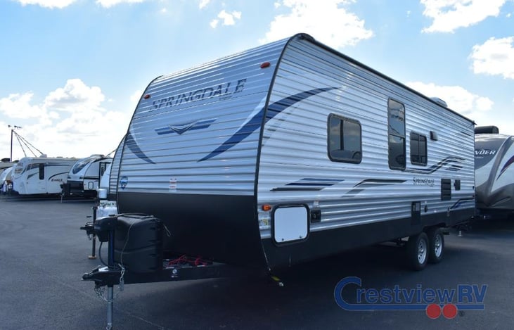 Brand new, used only 3 weeks, 2020 Keystone Springdale, most popular bunk in back model, top tier RV travel trailer, sleeps 5-6, with all the amenities- 3 burner gas stove, oven, microwave, freezer & refrigerator, convertible kitchen dinette, full shower with skylight, electric awning, indoor/outdoor bluetooth stereo, outdoor shower, queen sized bed in bedroom with door, futon style couch, wit