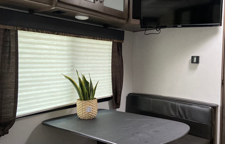 The full size queen bed has a very comfortable memory foam topper, dinning table folds into a sleeping area for the kids or 1 adult. The trailer has LED exterior lighting a power awning and exterior speakers , USB ports galore inside for your phone's.