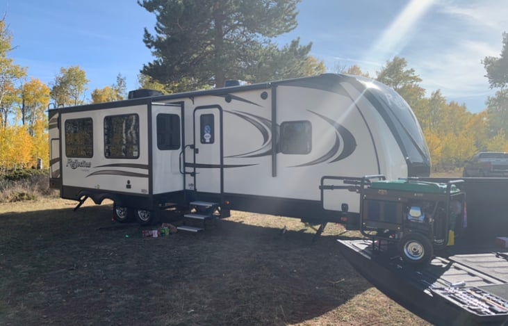 2 Bedroom Luxurious and Spacious Grand Design with double door refrigerator, oven, cooling/heating system, bathroom & shower, 2 flat screen tv’s, stereo with outdoor speakers, outdoor burner-refrigerator-sink, cozy electric fireplace w/temp. control, outdoor lighting, awning, portable generator, and outdoor hose to wash off anything needed.