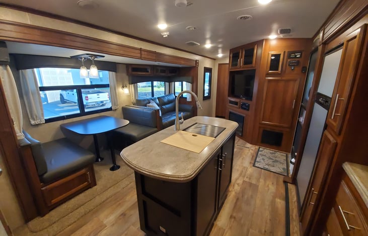 This is a fantastic family or friends RV. Extremly spacious with tripple slides and kitchen island. Bunk room has a swing door with its own TV. Bunk room has 6 beds, couch pulls out for a full bed as well as the dinette. (I really wouldn't suggest over 6-8 max adults if you want your own space.) Large bathroom with fullsize shower. Outdoor kitchen and TV. Bluetooth speakers inside and out.
