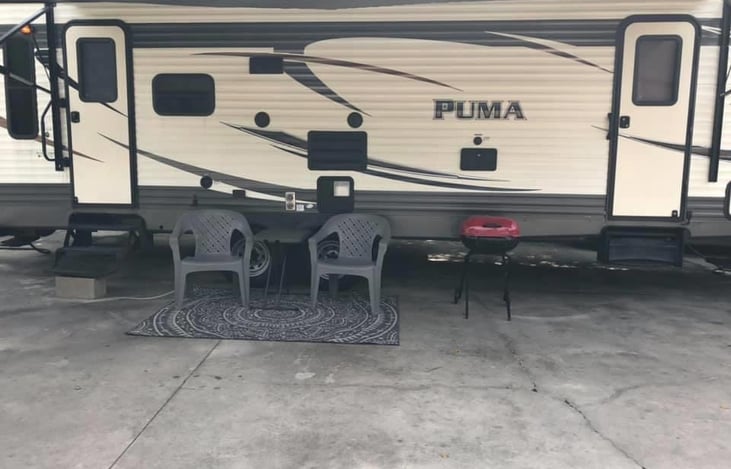 We have 2 chairs ,outside rug ,table and a BBQ pit.Also comes with bed linens,towels, wash rags,dish rags.Delivery Only.