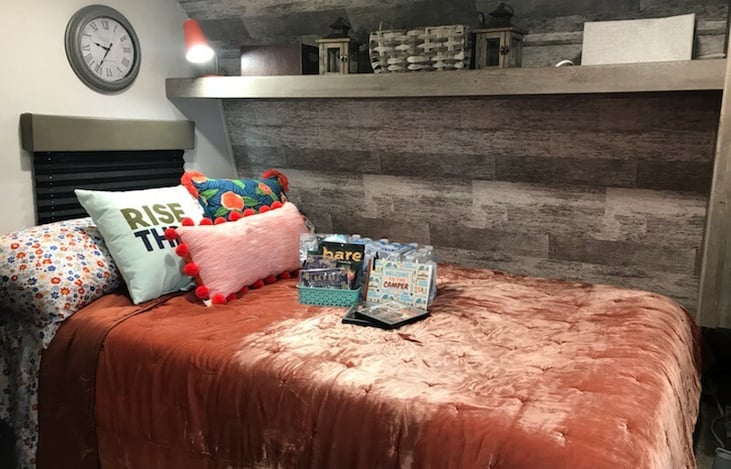 This mini retreat is packed with huge comforts and added supplies. It will sleep 5 comfortably (possible 6 if you have small children) with its one short queen, two twin bunks, and the dinette turns into a full bed as well.