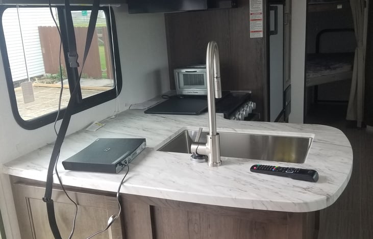 Our beautiful camper has one slide that automatically goes out, and has a sound system out side the camper to enjoy the radio outside, it also has a pullout cook top and mini fridge, and a shower sprayer on the out side to rinse ur self off with.