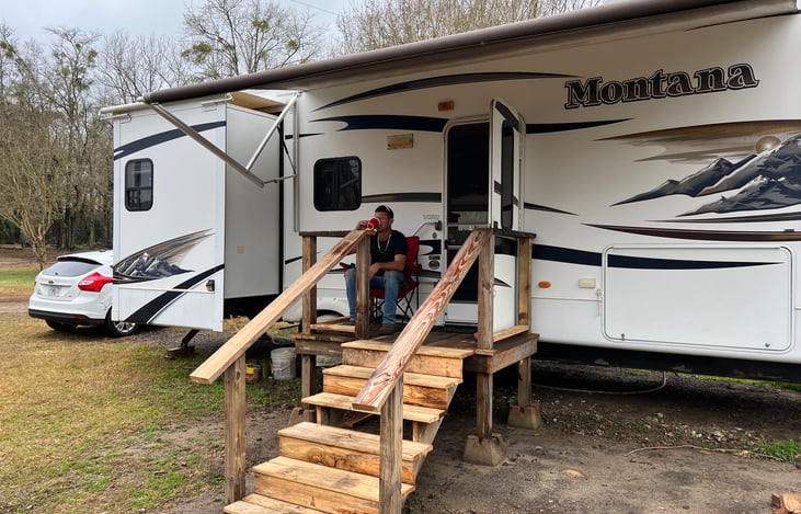 2010 34ft. Keystone Montana fifth wheel in excellent shape. I have it parked on a private lake, waterfront. It is not to be moved. It is equipped with a King size bed and queen size sleeper sofa with an inflatable mattress. 2 tv’s with unlimited channels, sports and entertainment. Electric fireplace makes it cozy inside. 3 slide outs for extra room. Dining table sits 4. 12 cubic ft. Refrigerator/ ...