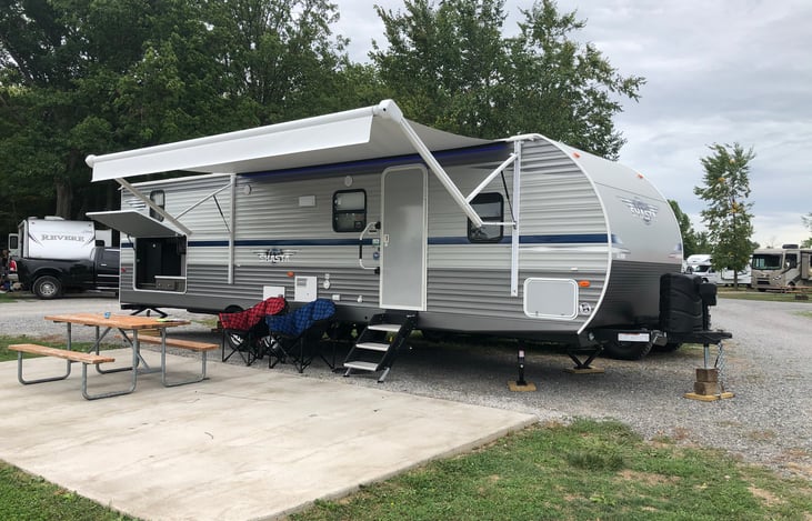 2021 Forest River Shasta! This camper sleeps 9 people and is great for families. It includes a full queen sized queen bed, bunkhouse, indoor and outdoor kitchen with grill. Outdoor 18 foot awning with indoor and outdoor speakers. Pots, pans, and dinner setting for 8 included for use at your leisure. All surfaces, linens and dish ware cleaned after each outing thoroughly.