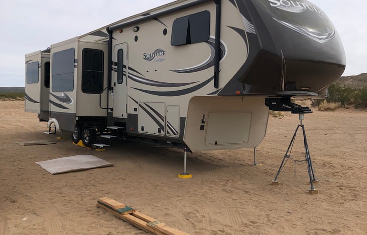 This RV is a 2015 Grand Design Solitude model 375RE. Grand Design is one of the leading manufacturers for comfort, convenience, and luxury in the RV industry.