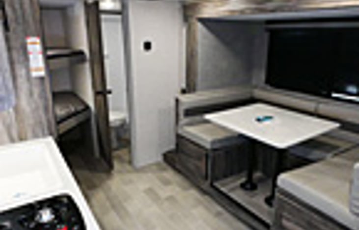Brand NEW!! Compact camper outside but spacious Inside. Slide out for U-shaped dinette for more seating and floor space. Murphy bed to allow easy sleeping to sitting accommodations. Outdoor griddle and fridge for outdoor cooking. Full fridge/freezer so you can leave the cooler at home. Shower. Power awning with outdoor lights. A/C , heat, and hot water heater.