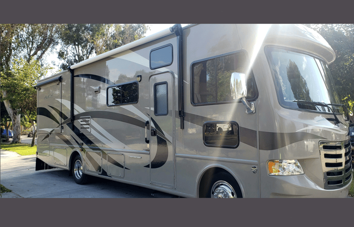 "Stay classy in San Diego!" Beautiful well kept Class A RV with all of the amenities you could want. Spacious floorplan, power automatic leveling and entry step, strong 15K BTU A/C unit, large walk around master w/queen bed and large wardrobe, plenty of storage space throughout.