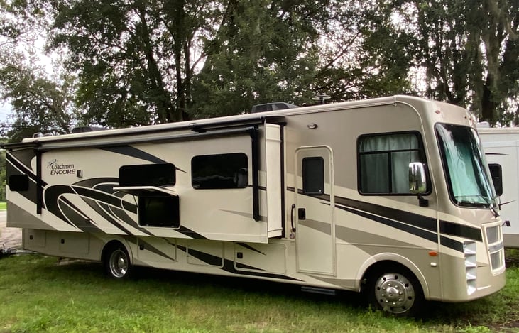 All New 2021 Coachmen Encore 355OS. This beautiful class A RV features a king size bed, drop-down loft, and a spacious living area. The well-appointed RV features the optional stainless appliance package which features a stainless residential refrigerator, over-the-range microwave, range and cooktop, as well as a stainless farm sink!
