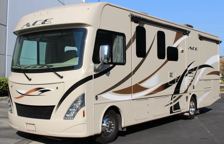 This 2017 Thor Motor Coach A.C.E Class A is in great condition. It is a 31 feet long motorhome with two slide-outs for extending the living area and the bedroom area. It is easy to drive with a V-10 engine and a 6-speed transmission. It has an outdoor kitchen with a refrigerator, sink, and storage.