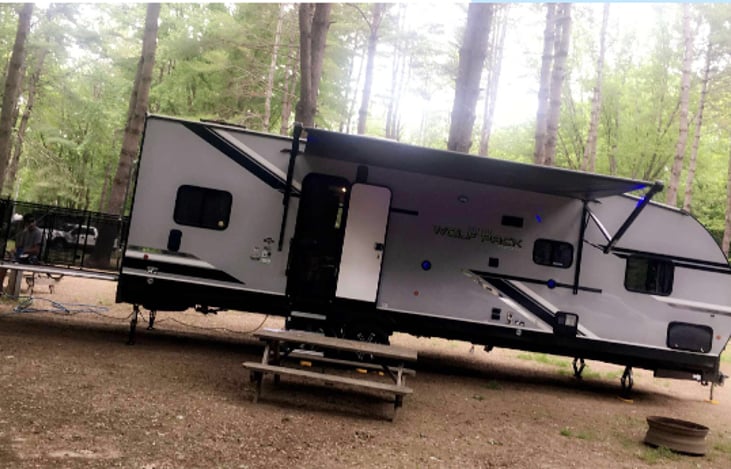 Beautiful 2021 Camper has outdoor and indoor speakers, 15 ft awning, rear ramp door patio with gates, convenient outlets all around along with usb plugs, and much more. Very cozy and warm camper ac is cool and it also has electric fireplace in living room under the tv for those colder mornings.