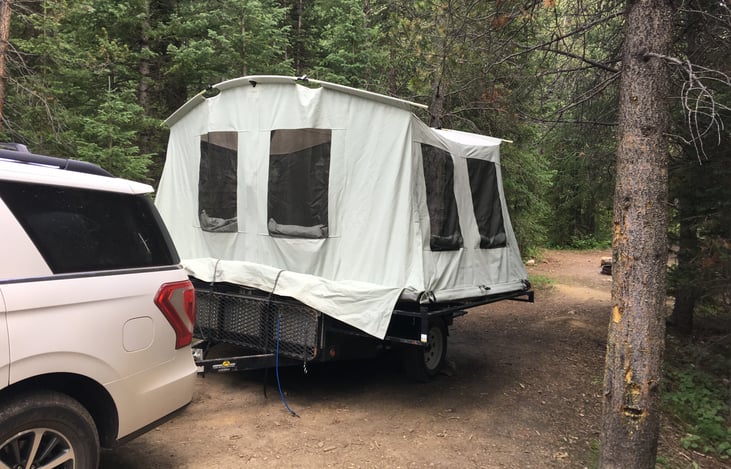 Jumping Jack tent trailer. Easy to set up. You can carry 2 ATVs or 1 Side by side on top.