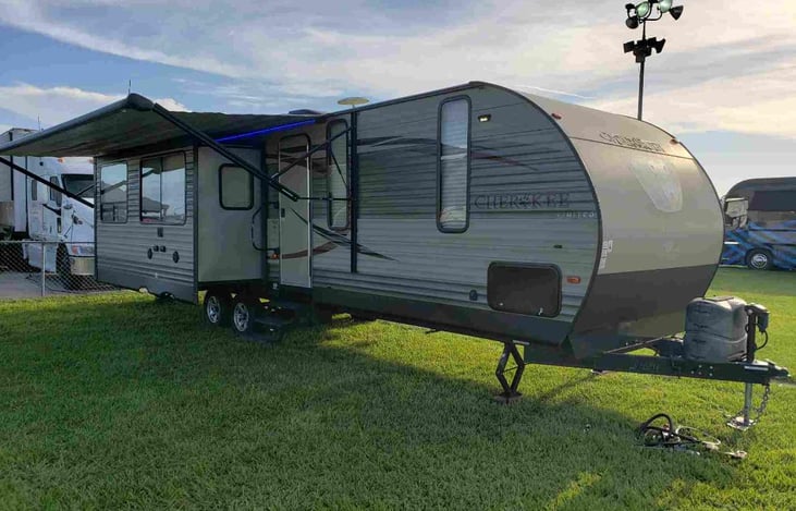 This very comfortable 35 Foot Forest River Cherokee is very light weight for the size. Can easily be towed by a 1500 or f-150. Master bedroom offers nice pillow top Queen size mattress, with lots of storage underneath the bed. Two separate closets on each size of the bed. Full size stand up shower in the spacious bathroom.