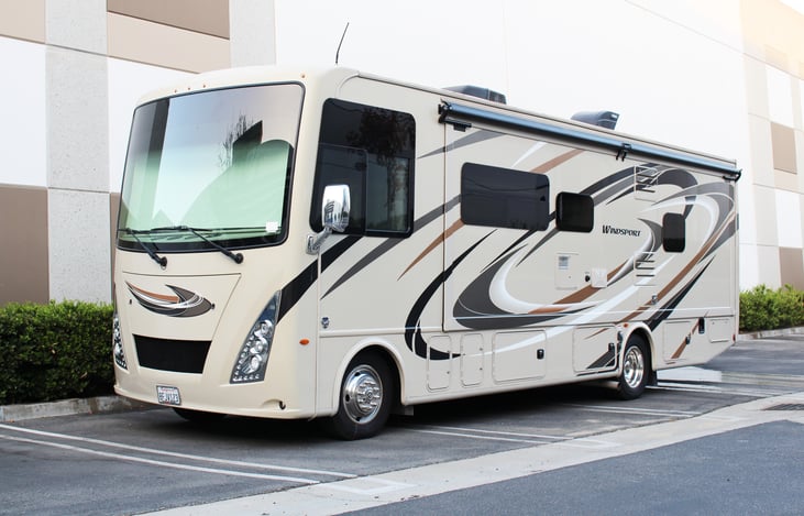 This 2018 Thor Motor Coach Windsport Class A is in great condition. It is a 30 feet long motorhome with one full side slide-out for extending the living area and the bedroom area. It is easy to drive with a V-10 engine and a 6-speed transmission. It has an outdoor kitchen with a refrigerator, sink, and storage.