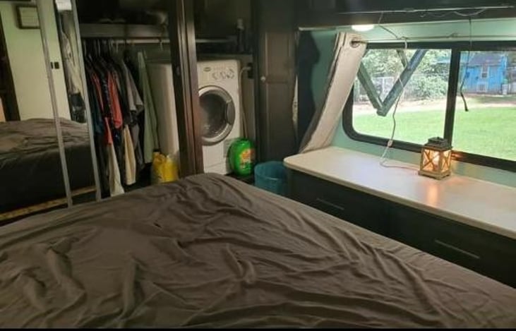 Our adorable renovated RV is for rent. Our RV comes with a pull out couch that will sleep two people, two recliners, a kitchen table with two chairs, queen size bed, washer/dryer combo, electric fireplace, AC in living room and bedroom, and fully furnished. Enjoy your stay at our cozy RV!!