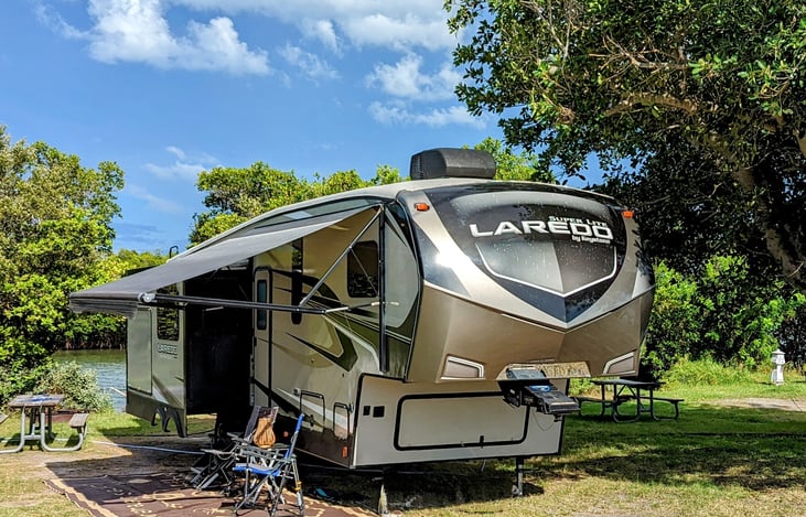Get ready to start your Fun in the Sun Vacation or Weekend get away!! We DELIVER and SET UP the Fifth Wheel Camper on YOUR RESERVED CAMPSITE!! FULLY STOCKED!! TV in Master bedroom, living room and FULLY EQUIPPED OUTDOOR KITCHEN with TV - Microwave - Fridge -Campstove.