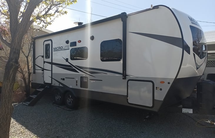 2022 Microlite 25FBLS by Forest River. Brand new, Sleeps 2, Queen Bed, Flat Screen TV, Electric Fireplace, Walk in Shower, Reclining Sofa, Solar Panels, Large Awning, Powerfull forced AC and heating system.