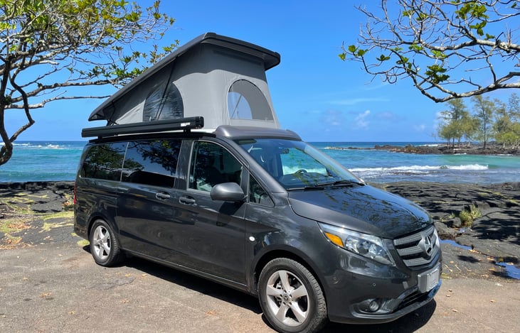 Located in Kona on the beautiful island of Hawaii (The Big Island), Hapuna is one of Campervan Hawaii’s Mercedes Metris pop-top campervans with seating for 5 and is great for cruising around the island.