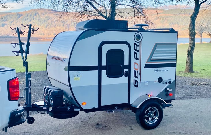 "Joey", the Rockwood Geo Pro 12RK is your small basic trailer that meets all the needs of anybody that has a small vehicle to tow with or just needs a little something to sleep in and enjoys cooking outside. This unit comes with an electric heater, air conditioning, a TV, DVD player, CD player, Bluetooth stereo, WiFi booster, refrigerator, microwave, outside sink and a gas stove.
