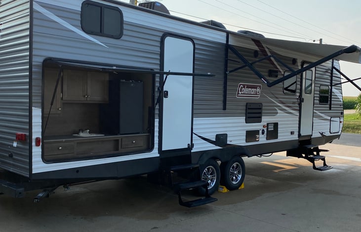 The camper two slide outs one in the bunkhouse and one in the main area. Very spacious camper. Also has a large outdoor kitchen. This camper is equipped with all the necessities including bedding for all beds, dishes, silverware, pots and pans. We also equipped bathroom necessities (toilet paper, hand soap, tissues, etc,)