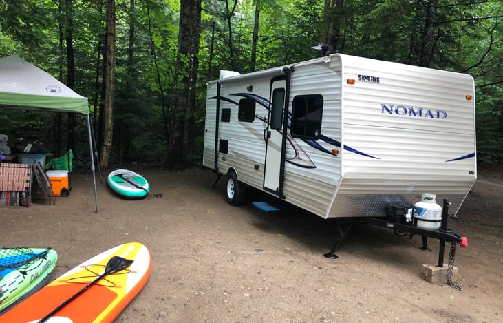 At only 2,725 lbs. (dry weight), this camper is a breeze to use and fun to camp with! Convenient pickup/drop off location right off I-95 on your way up to camping in Maine! Nice propane powered furnace for cold nights! Connect to 2+5/16" ball. 7 way wiring for lights. 20' in length, single axle.