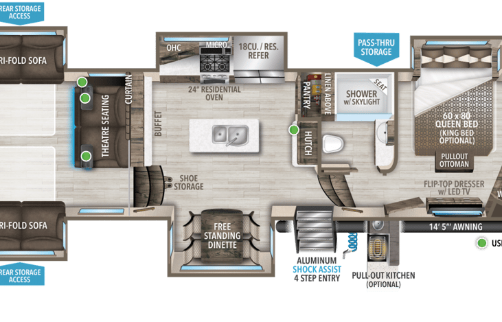 Grand Design Solitude is a very spacious and comfortable high end RV. The 375R-Res has residential appliances that are spacious and modern. Master suite has queen size memory foam mattress with spacious closets, chest of drawers, satellite TV, and high speed WiFi service onsite. Rear living area has 2 recliners and two loveseats. Both love seats can convert to a full size bed.