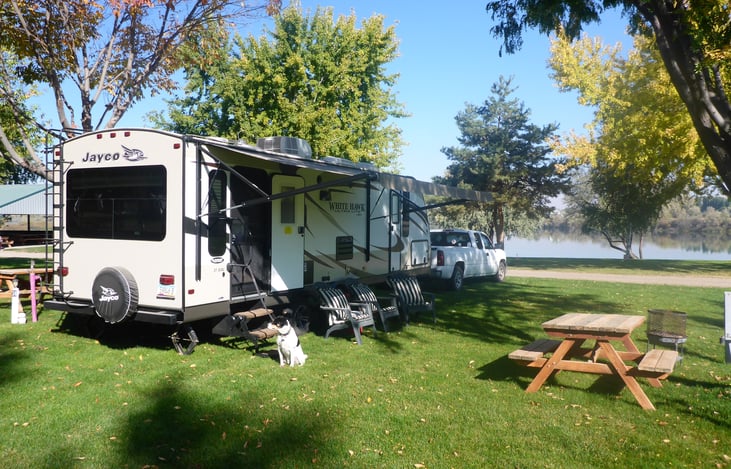 The Love Shack is a very spacious , comfortable home away from home with rear living room that has a large bay window for that spectacular view . One slide out , power awning , power tongue jack. All the luxury immenities of a hotel room . TV, stereo, outdoor beer fridge and outdoor shower for Fido and much more.