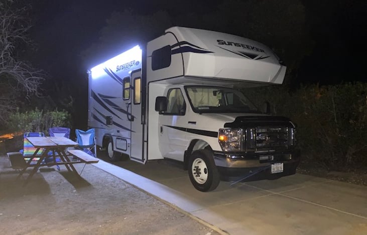 Our baby is a 2021 Sunseeker super clean easy to maneuver and easy to get into almost any parking space. It comes with a 14' awning and LED light, a full-size refrigerator, Bluetooth connectivity to inside and outside speakers, and a lot of cool things to enjoy your getaway!