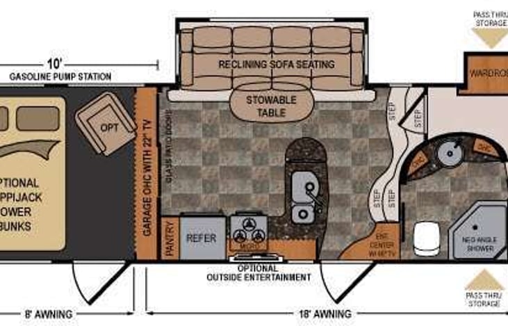 10 foot toy hauler garage. Dry camp ready with generator 4 hours per day included with rental. Bring the dog, the kids, and of course the toys.