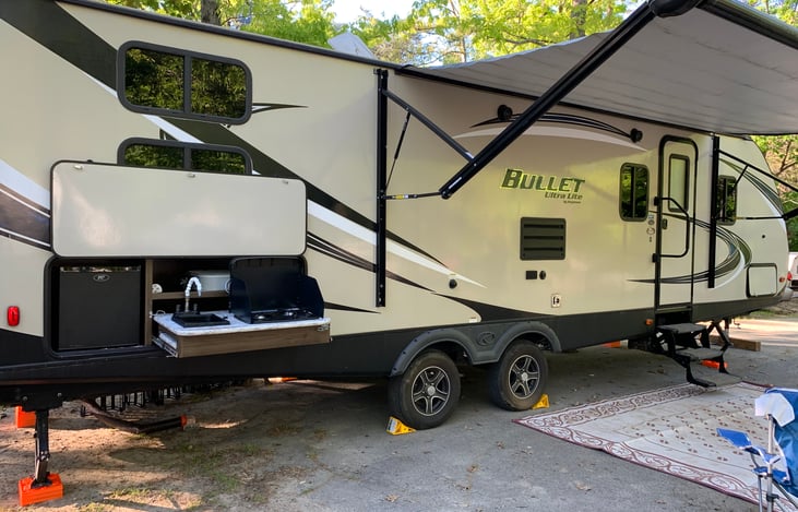 Tan Lines is a classy 2018 Keystone Bullet that sleeps 10 and has all the room you need to enjoy yourself without others getting under your feet. The power slide out with power retractable awning is a very nice feature you'll be sure to enjoy. Bunk beds in the back and a queen bed in the front provides more sleeping privacy. You might even avoid that someone who snores!