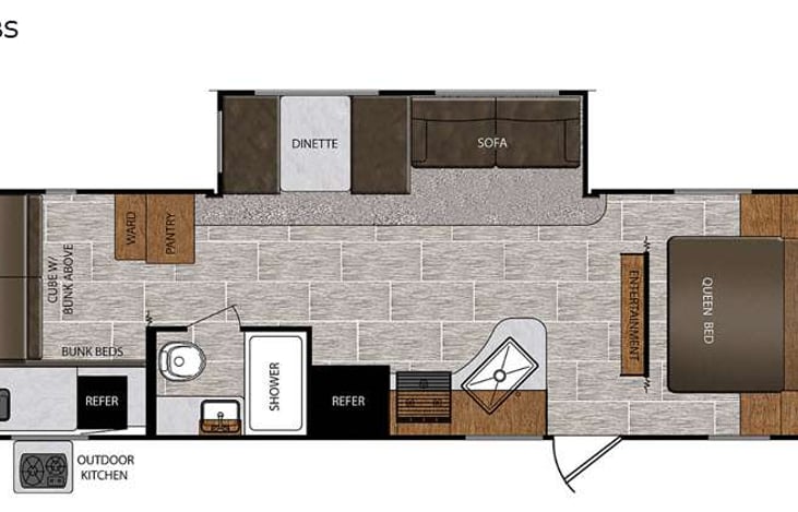Our travel trailer features two private bedrooms, one up front with a queen bed and the other in the back with three bunk beds. This unit features a large slide where the dining table and loveseat sofa are located.