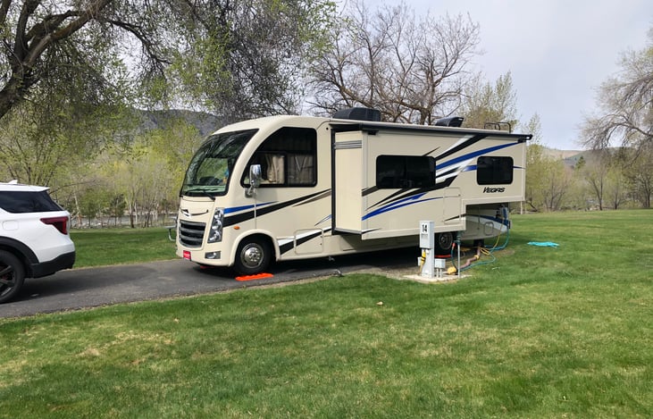 We love our RV because it is a Class A motorhome that lets you travel in style. The RV provides back, side and front camera and is easy to access anywhere even in the city with no required permit.