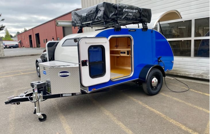 Introducing Levi, our mighty Aero Steel teardrop RV. With room for up to 5 people, Levi is perfect for families or groups of friends looking to hit the road and see all that the great outdoors has to offer. And with a queen size mattress and rooftop tent, you'll have plenty of room to sleep comfortably at night.