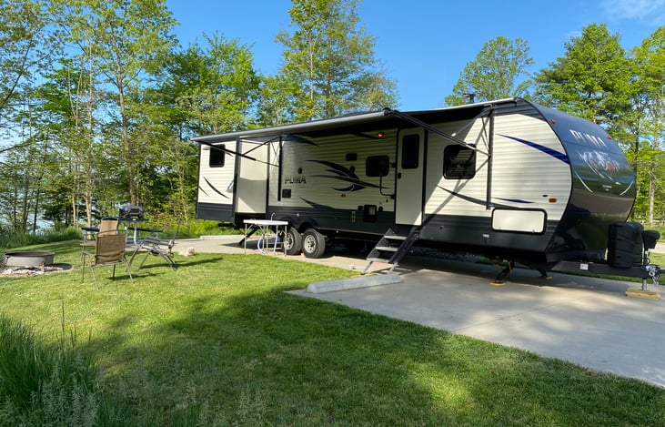 Our 37' Private Oasis is a very modern and spacious camper with room to sleep 9. With 3 slide outs and all the amenities of home our camper has all your needs covered. Fully equipped kitchen including refrigerator, stove, oven, cooking and serving utensils as well as dish towels. All pillows, linens and bath towels are included as well to make your stay comfortable.