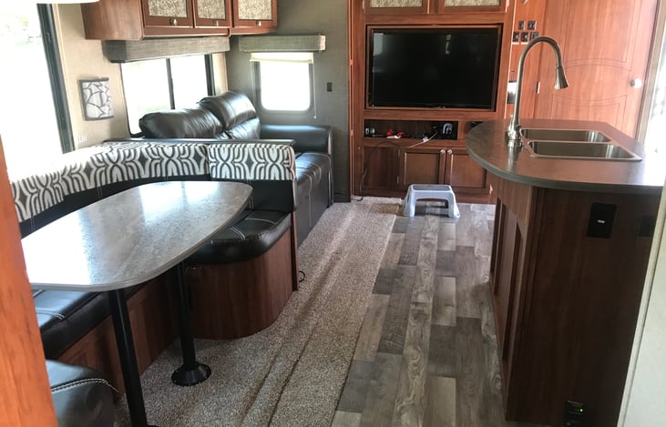 Fully furnished camping experience. It has 3 slides and is designed with an island, 43" smart TV in the living room, 40" TV in the bunk and sleeps 10 max. Kitchen has mid size fridge, 3 burner stove and microwave. Outside entertainment center has a fridge, sink and tv. FULLY STOCKED - linens, dishes, chairs, propane grill, charcoal grill.