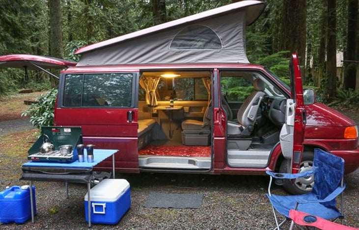 RON BURGUNDY is a super comfortable, kid-friendly Eurovan Westy fully restored and adventure ready! Slide out camping Air Conditioner! Sleeps 4 with Queen size bed below and queen size bed in pop top.