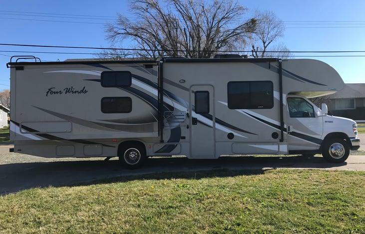 Easy driving, extra clean 2018 Thor Four Winds 32’ double slide bunk house has a rear bedroom with walk around queen bed, cab over queen and a table and sofa that can be made into a double bed the two bunks slide out this can sleep a family of ten with a total of six beds. The living room has a slide out for more room when you are camping.