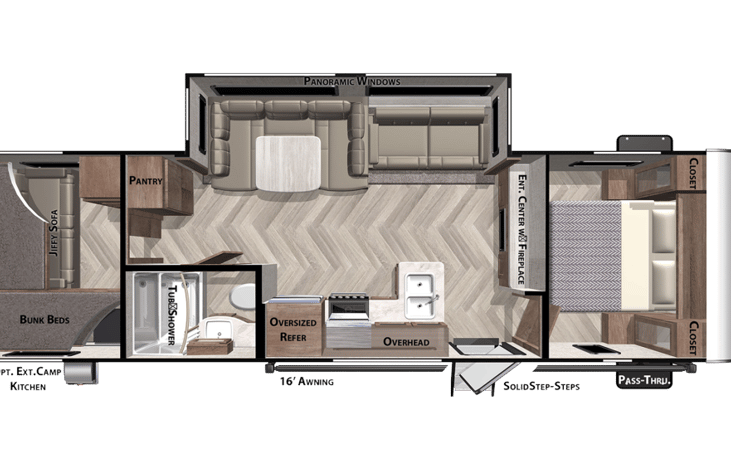 This rig has one of the best bunk room layouts you'll find! We specially chose this trailer with our teen boys in mind because they get their own room!