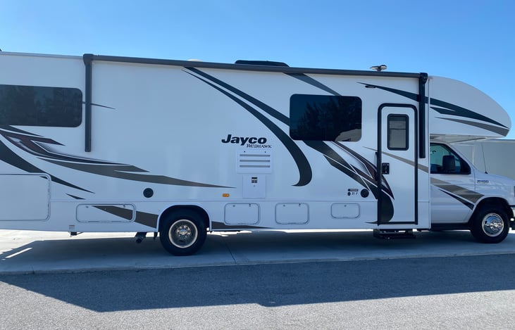 Brand new 2021 Jayco Redhawk 31F with bunks. Sleeps 8 comfortably, possibly 10 with smaller kiddos. Includes queen bed in the back, bunks in the hall, over the cab large queen with tall ceilings, dinette conversion, and the sofa converts to a futon. The kitchen has double sinks, 3 burner stove/oven combo, and a convection microwave. Stocked kitchen with everything you need!