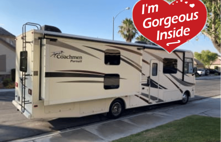 This Class A motorhome, nicknamed "Coco," is perfect for a fun-filled family adventure. A 2019 Coachmen Pursuit 33 BHR with bunk beds, can sleep 8-10 comfortably. Two TVs, two DVD players, and a Bluetooth stereo are all included.