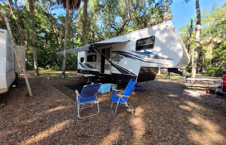 Welcome to your home away from home! There is plenty of room for the whole family to enjoy and make lots of memories to cherish! Inside the camper you have all the amenities of being at home and outside you can cook and relax under the huge covered awning.