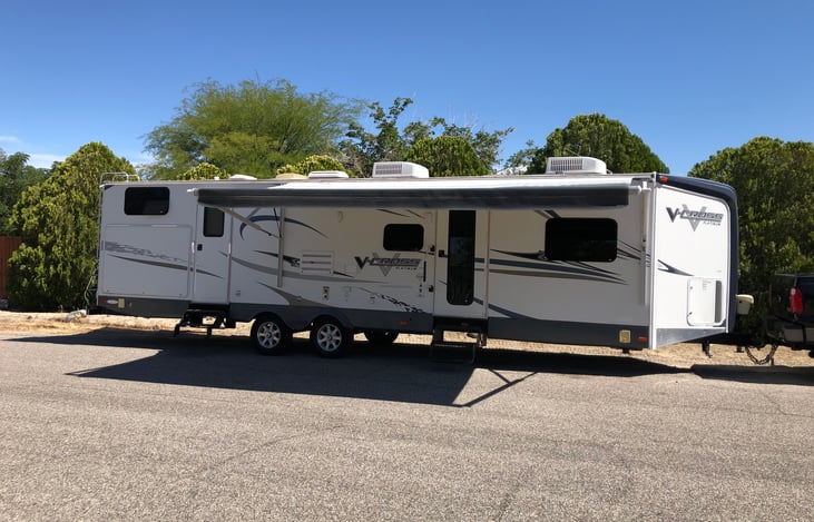 This is a beautiful Forest River trailer that is all you need for a comfortable vacation with the family or friends. The trailer provides a private front master bedroom, with a space for the Kids in their own room in the back. The back room consists of 2 twin beds and a fold out king size bed. You can relax under the stars or hang out under the awning next to the out door kitchen.