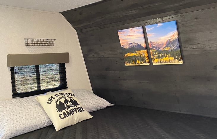 Enjoy the wonderful outdoors Wyoming has to offer with the ease of renting! Everything you would need is fully stocked in our camper. One queen bed, two twin bunk beds and a smaller than-twin size fold down table. Clean sheets, blankets and pillows provided for every bed, enough for six people. *We do not provide shower linens.* Kitchen utensils including knives, cups and plates for six.